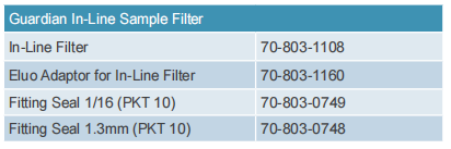 如果您的样品中有颗粒,则存在样品管或者雾化器被堵塞的风险。Guardian在线样品过滤器提供了一种简单有效的方法来消除这种风险。该过滤器可轻松连接在自动进样器进样针和雾化器的管路之间。它集成了一个120微米PolyComb过滤器,适用于1/16 英寸外径或外径1.3毫米的样品管。