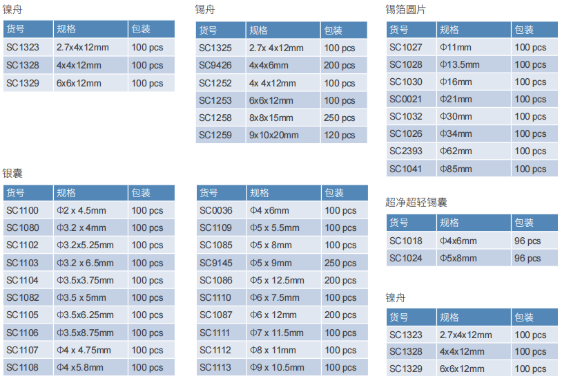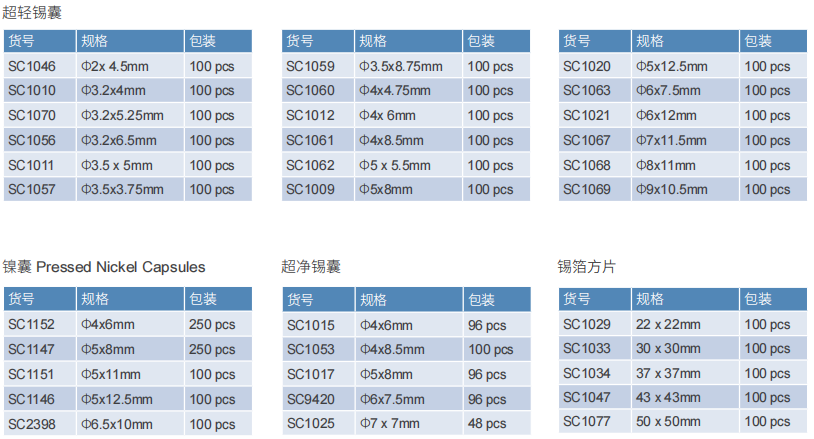 锡囊和锡舟,用于CHN/CHNS分析装固体样品;经过超声波精密清洗的超净容器,适用于低含量和同位素分析样品;银囊和银舟用于O/TOC分析或用于CHN分析含酸的固体样品。