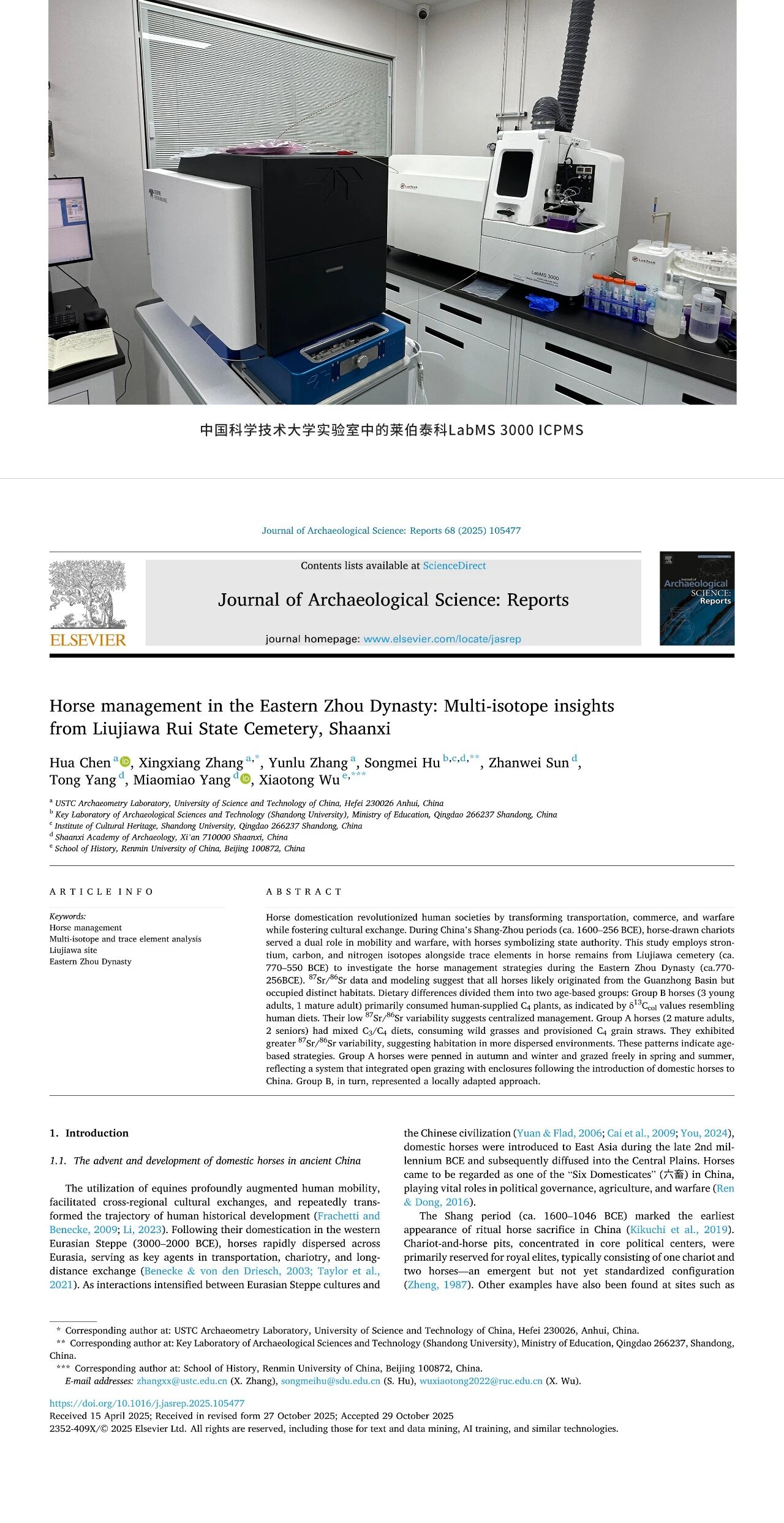 近期,浩博体育appICP-MS用户——中国科学技术大学,联合山东大学和陕西省考古研究院等机构,在《Journal of Archaeological Science: Reports》[68 (2025) 105477]发表新研究成果《Horse management in the Eastern Zhou Dynasty: Multi-isotope insights from Liujiawa Rui State Cemetery, Shaanxi》,通过ICP-MS技术,系统揭示东周时期芮国贵族墓地祭祀马匹的精细化饲养体系,为探索早期国家礼制与畜牧经济提供关键实证。