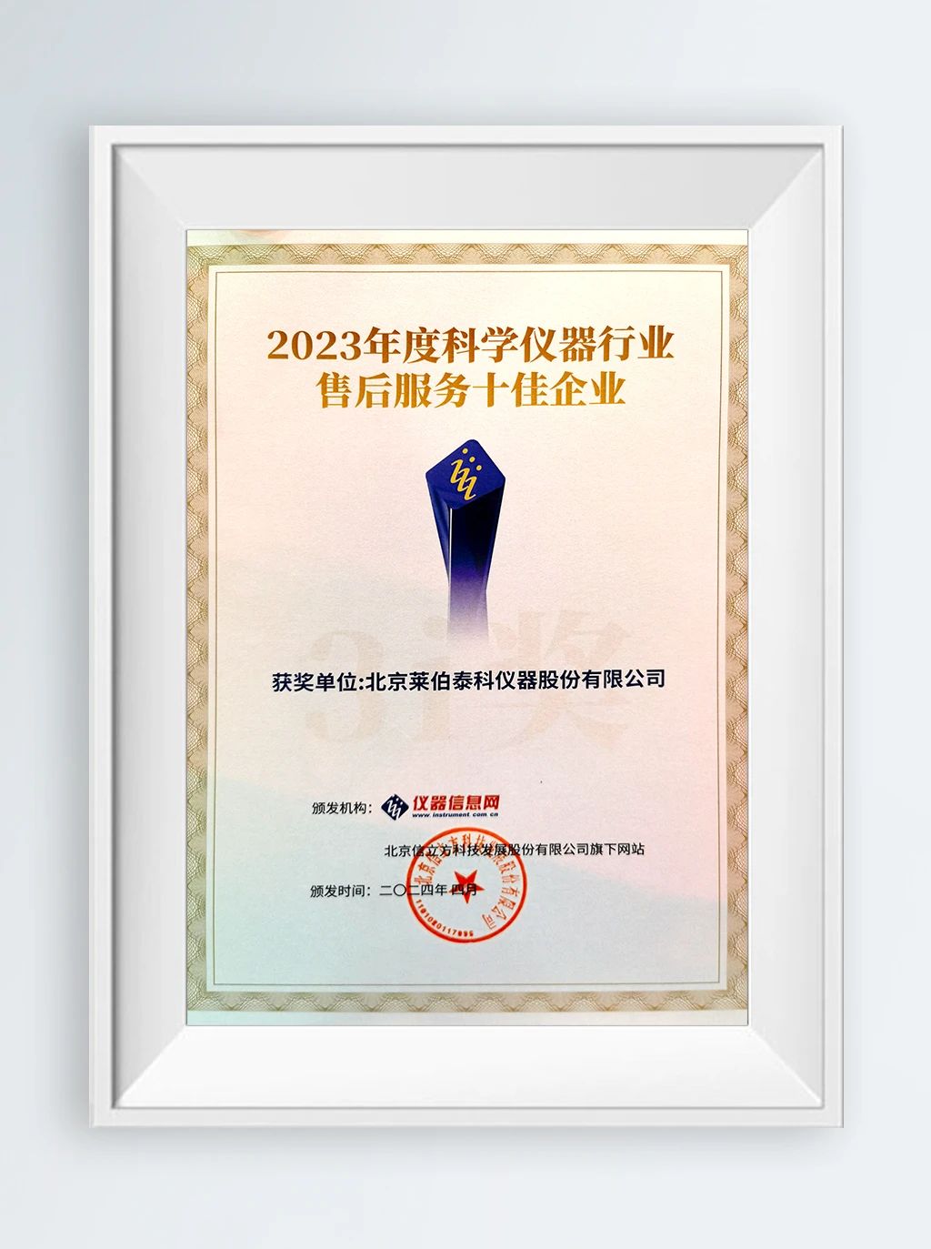 “2023年度科学仪器行业售后服务十佳企业”证书
