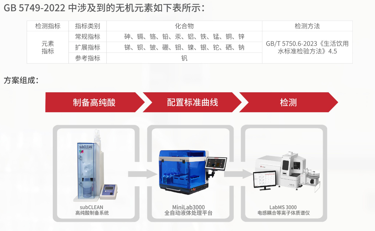 迈尔斯通的 subCLEAN 高纯酸制备系统可满足痕量元素检测中高纯酸低本底的实验要求,用 MiniLab 3000 液体处理平台配置标准曲线,可避免手动配置过程中产生的人为偏差,重复性好。LabMS 3000 测定生活饮用水中 31 种金属元素含量,对方法的检出限,精密度和回收率进行了研究,结果表明:该方法灵敏度高、重现性好、准确度高,满足生活饮用水检测需求,特别适合于超痕量的铍、镉、铬、汞、锑、铊等元素的测量。