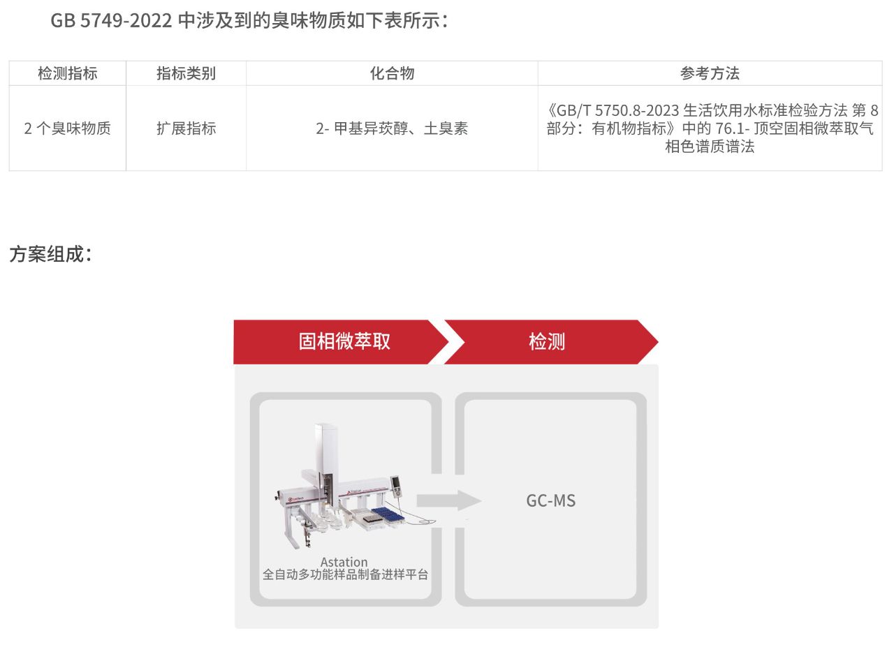 本方案中采用的固相微萃取方法简便、快速,可以实现水中有土臭素和 2- 甲基异莰醇的萃取及在线分析的全自动操作,适用于水中痕量臭味物质的检测分析。