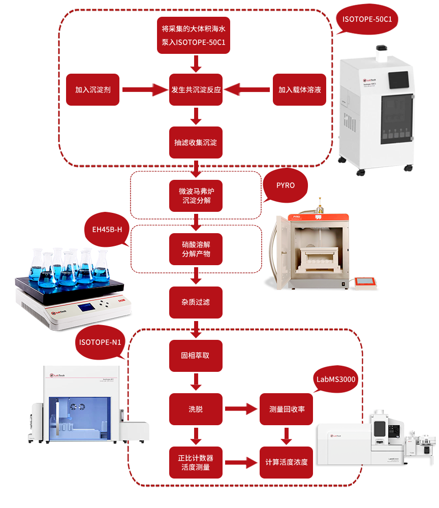 方案融合了多款自动化前处理设备和分析仪器,包括全自动核素固相萃取装置、共沉淀分离装置、高效核素分离系统以及电感耦合等离子体质谱仪。这些仪器设备的协同作用,能够实现海水中放射性元素的快速分离、样品制备和检测,使整个检测过程更加智能高效。