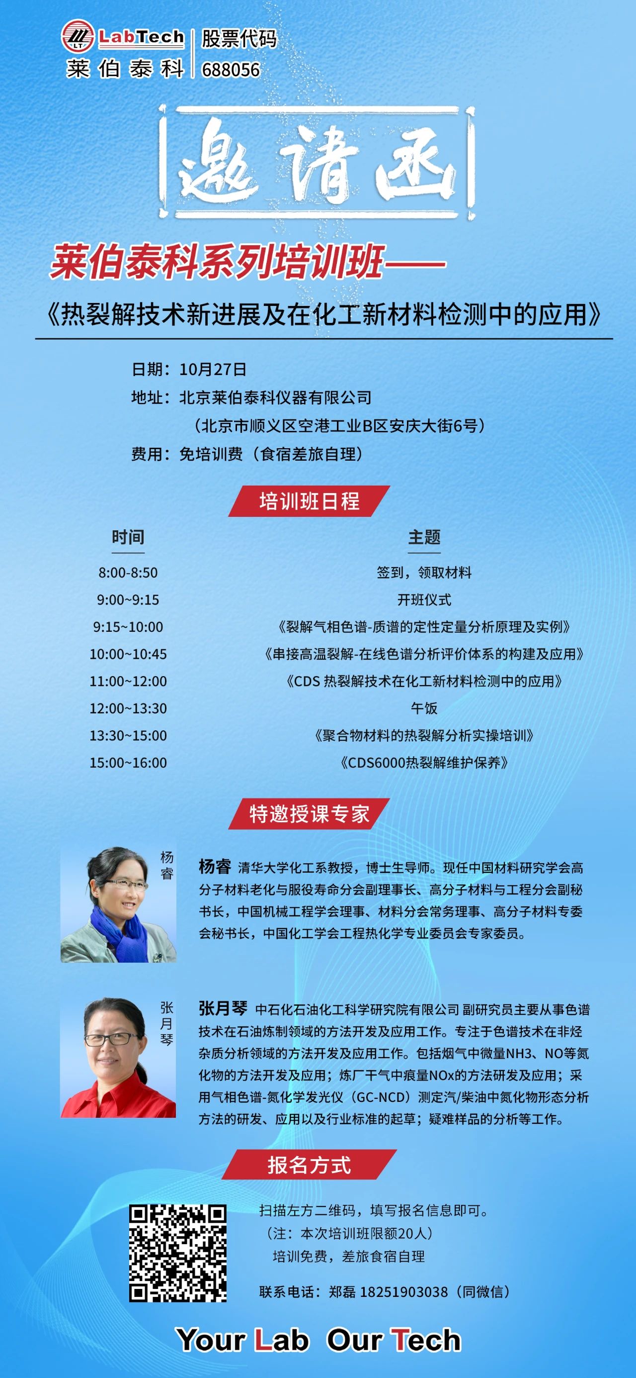 浩博体育app专注为广大用户提供实用可靠仪器的同时致力于全面提升用户实验室智能自动化水平及分析检测能力。2023年10月27日,我们将于北京举办《热裂解技术新进展及在化工新材料检测中的应用》培训班。