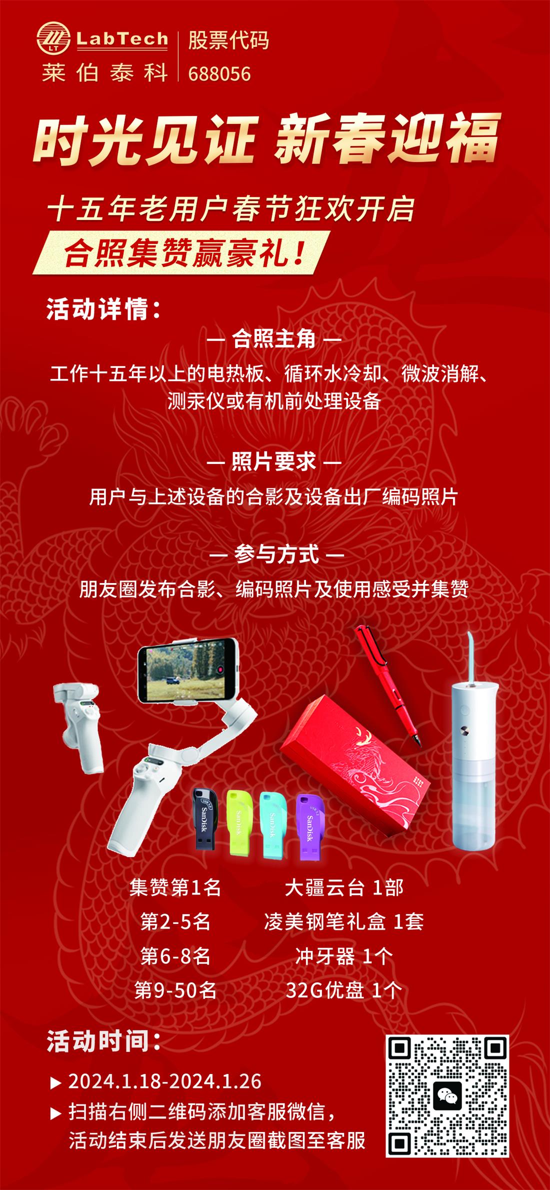 活动简单易参与,只需与“老朋友”——生产满15年且还在服役的电热板、循环水冷却、微波消解、测汞仪或有机前处理设备合影,转发朋友圈并集赞,即可参加我们的新春赢豪礼活动。