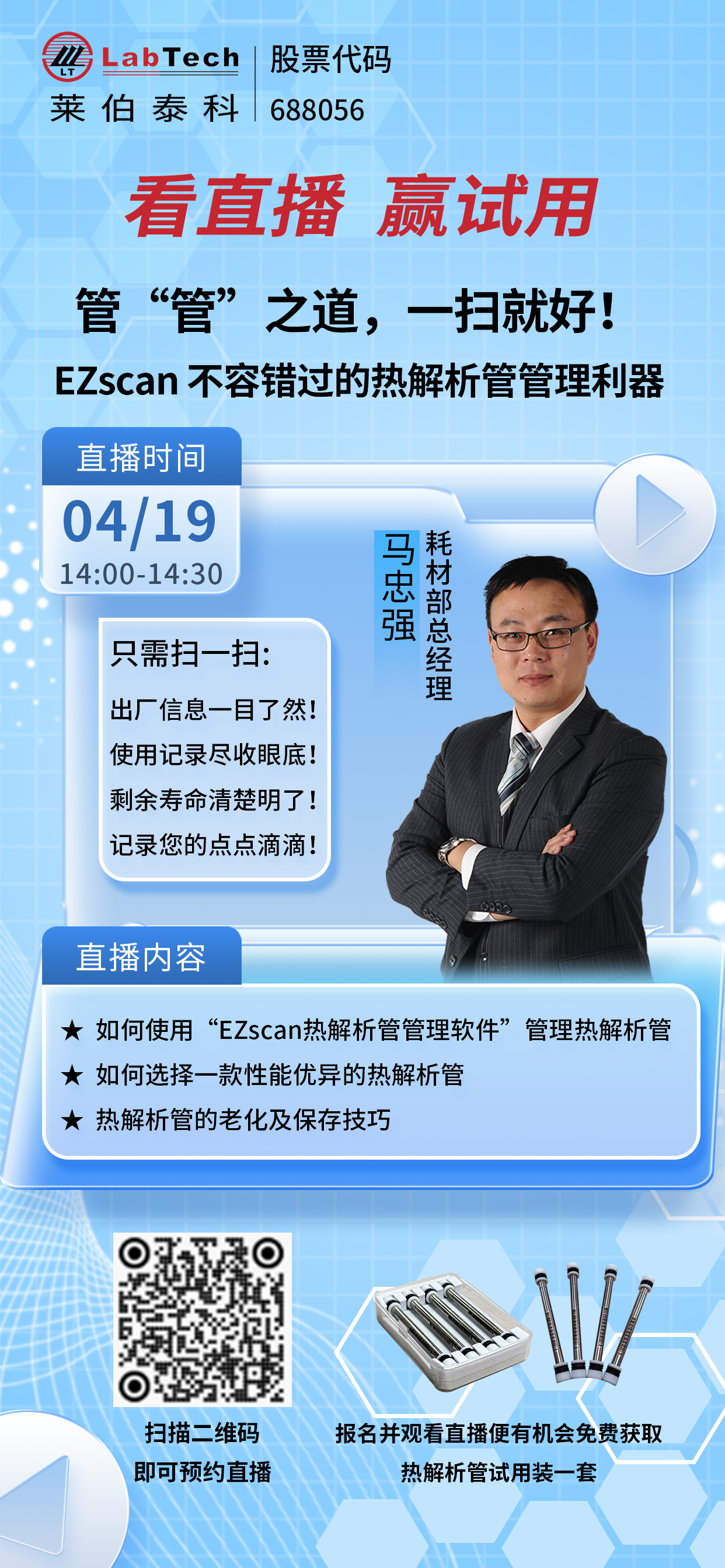 EZscan热解析管管理软件,完美解决您的问题! EZscan是浩博体育app推出的一款基于安卓系统的网络版热解析管管理软件,只要您有一部安卓手机或平板电脑,随时随地都可以扫出热解析管的使用信息和记录。即使在野外,只要有网络在,就可以随时扫描和记录! 只需扫一扫,出厂信息一目了然! 只需扫一扫,使用记录尽收眼底! 只需扫一扫,剩余寿命清楚明了! 只需扫一扫,记录您的点点滴滴! 本次直播将为您展示: 1、如何使用“EZscan热解管管理软件”管理热解析管? 2、如何选择一款性能优异的热解析管? 3、热解析管的老化及保存技巧! 报名并观看直播有机会免费获取EZscan热解管试用装一套!