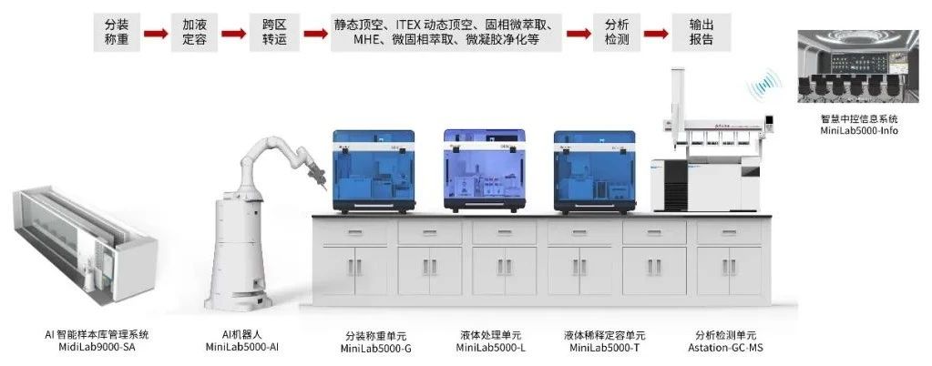 MidiLab9000-E无机元素在线分析系统集成智能化样本库管理、分装称重、全自动消解、稀释定容,与质谱、光谱分析方法相结合,通过小莱AI机器人,完成待测样品的转运,实现从样品管理到分析检测全流程自动化。