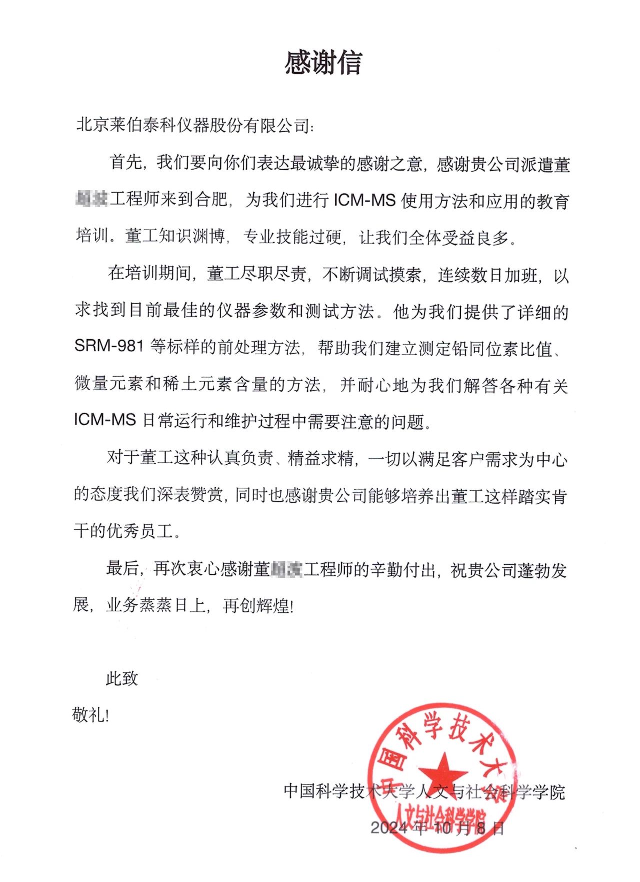 产品优异,服务贴心,口碑自然来!近日,浩博体育app凭借其细致入微且高度专业的售后服务,再次赢得了客户的广泛赞誉。公司相继收到了中国科学技术大学人文学院及扬州市高邮环境监测站专门针对ICP-MS工程师的感谢信,这不仅是对工程师们专业度的由衷认可,更是对浩博体育app“以客户为中心”服务理念的高度赞扬与肯定。