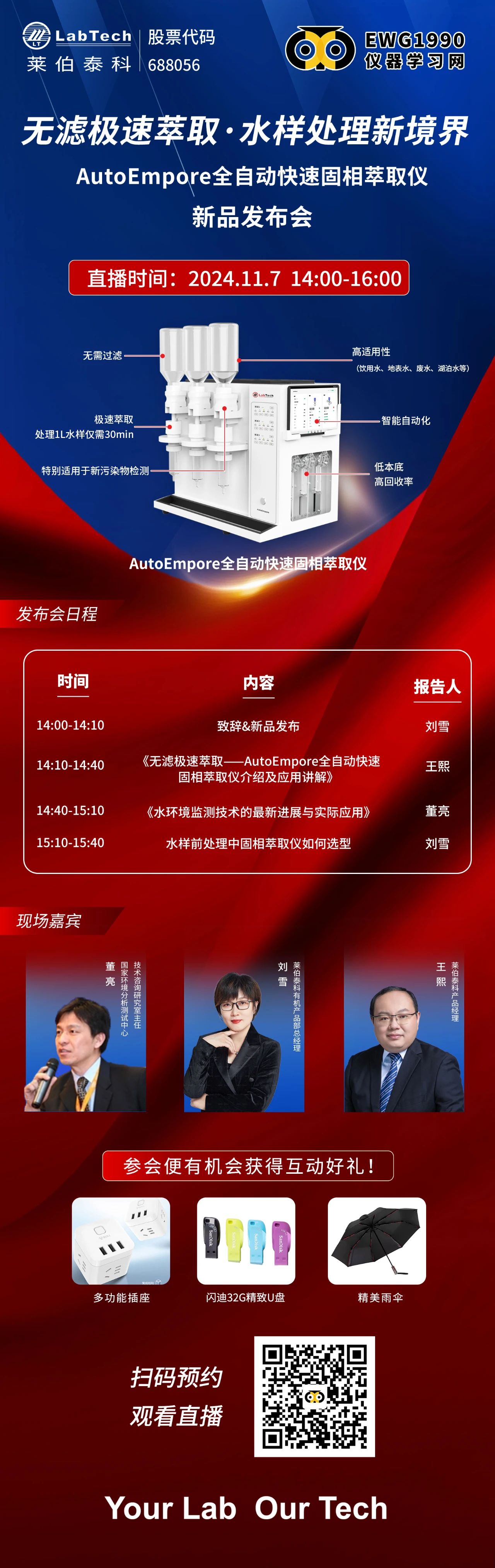 浩博体育app将于11月7日盛大举办“无滤极速萃取 · 水样处理新境界——AutoEmpore全自动快速固相萃取仪新品发布会”。此次发布会不仅标志着浩博体育app在水样前处理技术领域的又一重大突破,更将为环境监测、水资源管理以及科研领域带来更加高效的解决方案。